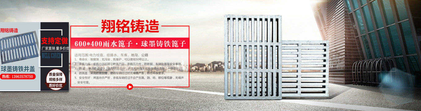 山東翔銘金屬制造有限公司擁有雄厚的技術(shù)力量,設(shè)備齊全,檢測(cè)手段完善,管理方法科學(xué)。隨著改革開放的不斷深入,市政建設(shè)正日新月異地飛速發(fā)展,本廠愿積極的態(tài)度為城市建設(shè)現(xiàn)代化做出應(yīng)有的貢獻(xiàn)。球墨鑄鐵井蓋,雨水鑄鐵篦子,車庫(kù)篦子,排水溝蓋板,球墨鑄鐵篦子具有優(yōu)良的耐腐性能,強(qiáng)度高,抗強(qiáng)壓,抗挫,抗拉,抗沖擊及承載能力強(qiáng),防盜,安全等優(yōu)點(diǎn)。使用說(shuō)明經(jīng)過(guò)國(guó)家化學(xué)建材質(zhì)量監(jiān)督檢驗(yàn)中心及質(zhì)量技術(shù)監(jiān)督檢驗(yàn)研究院的化學(xué)檢測(cè),技術(shù)指標(biāo)可長(zhǎng)達(dá)50年之久,球墨鑄鐵井蓋是市政建設(shè),城市綠化的選擇。多年來(lái),本廠產(chǎn)品暢銷省內(nèi)外,質(zhì)量可靠,售后服務(wù)完善,深受廣大用戶的好評(píng)。